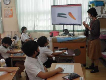 今日の授業は、野菜のお話でした。「色の濃い野菜」と「色の薄い野菜」をグループに分けました。例えば、きゅうり。子どもたちは、「色の濃い野菜」だと予想した子がほとんどでした。でも、実は「色の薄い野菜」のグループに入るのだそうです。外側は濃い緑色だけれど、切ってみると白っぽい黄緑色だからだという理由を聞いて、「そういうことか!」と納得した様子でした。