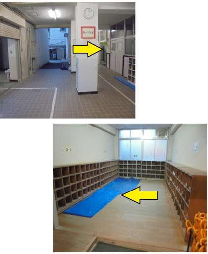 鉢の置き場所ですが、玄関から教室へ向かう廊下の途中を、右に曲がると、1年生の集中下足室があります。そこへブルーシートを敷いているので、その上に並べて置いてください。