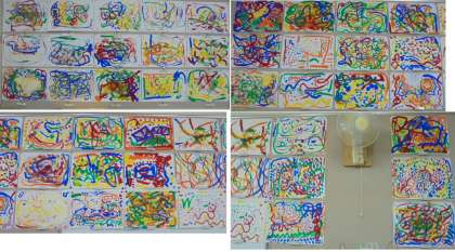 教室の掲示は、「せんのかんじ いいかんじ!」です。初めて絵の具を使い、筆の筆圧の違いで、いろんな線を描きました。