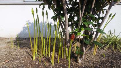 9月15日(木)保健室前の校庭の花壇にあるキンモクセイの周辺からニョキニョキと何やら芽が出てきました。これは何の花か分かりますか。ヒントはTVアニメ「鬼滅の刃」のエンディングに出てきた花です。