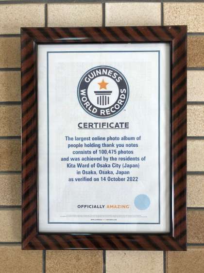 10/24(月)の児童朝会で、前田区長から贈呈されたギネスの認定書。児童だけでなく、保護者や地域のみなさんに見ていただけるように、玄関に飾ることにしました。ご来校の際には、ご覧ください。