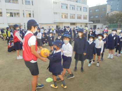 今回の児童集会は、「ボール渡し」でした。