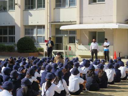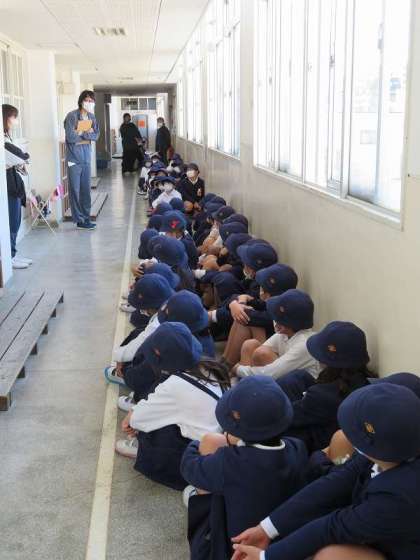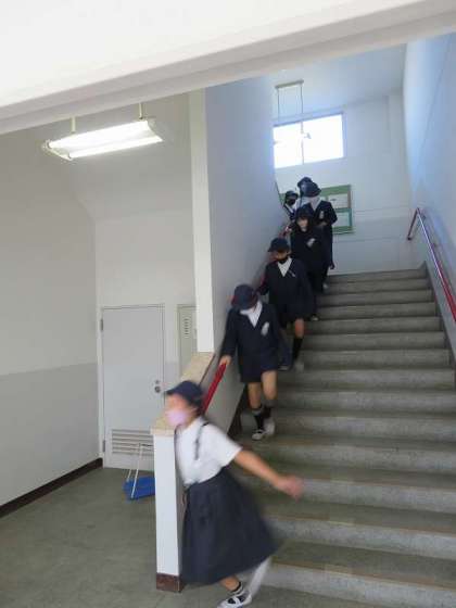 地震が発生し、建物倒壊の恐れがあるので運動場に避難。その後、地震による津波発生の可能性があるので全ての児童が3階に避難しました。運動場へ避難するときも、3階へ避難するときも「お・は・し・も」の約束を守って避難することができました。