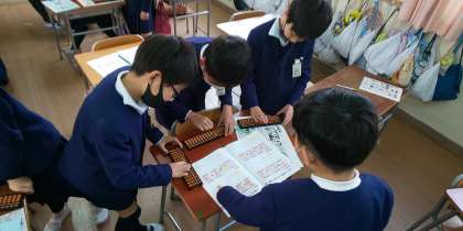 1月13日(金)に、そろばんの先生に来ていただき、教えてもらいました。初めてそろばんを触る子ども達も多く、「ジャー」や「パチパチ」と音を立て、楽しそうに取り組んでいました。1万などの大きな位から、小数第一位など小さな位をそろばんで入れることや、くり上がりのない計算を学習しました。