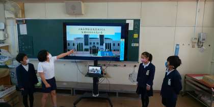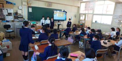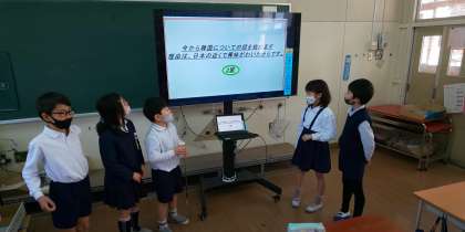 今回は、タブレットでスライドショーを使って紹介しました。1人1ページ担当し、紹介したので子ども達も必死です。テレビ画面を指しながら、大きな声でみんなに話すことができました。「サウジアラビアは食事に左手を使わない。」と聞いた時には、思わず「え〜!」と声が上がっていました。質問タイムは、調べていないことを聞かれて、タジタジ…。発表の楽しさだけでなく、難しさも感じることができました。