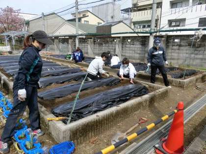 来年度の野菜・花を育てるために、マルチを取り除き、土を耕し、畝(うね)を作って再びマルチを張りました。