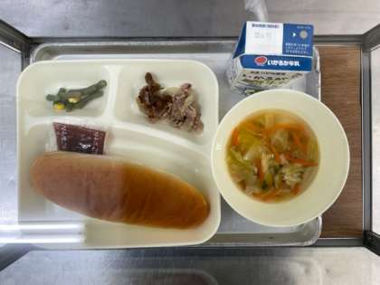 豚肉のガーリック焼き、スープ、さんどまめとコーンのサラダ、パン、牛乳