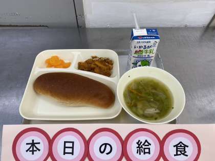 じゃがいものミートグラタン、レタスのスープ、みかん(缶)、パン、牛乳