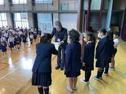 校長先生のお話の後、地域ジュニアバレーボールチームの表彰がありました。
