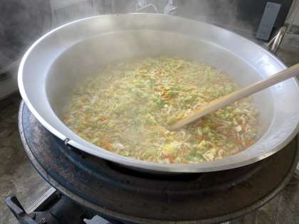 みそ汁は大釜で大量に煮込みます。
