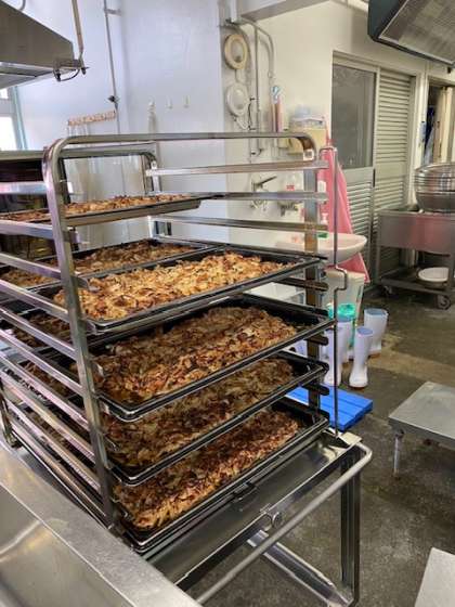 豚肉のしょうが焼きは焼き物機で加熱しています。