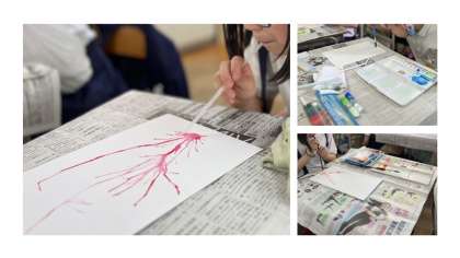 図画工作科の学習では,絵の具をストローで吹き流しました。「大きなふし木」をテーマに,ストローで吹くことで,木の自然な動きを表現することができました。子どもたちは大きな画用紙を前に,少し苦しそうでしたが,最後まで一生懸命に取り組みました。