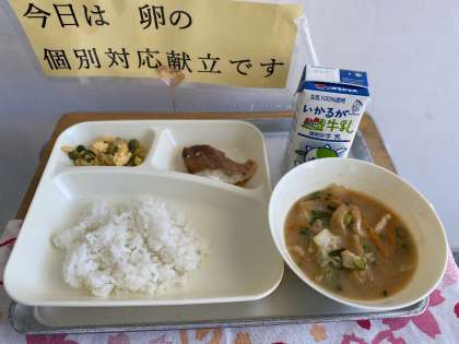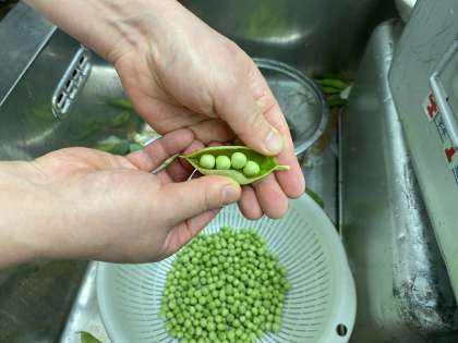 えんどうは朝早くから調理員さんがさやから取り出してくれた生のえんどうを使って卵とじにしました。