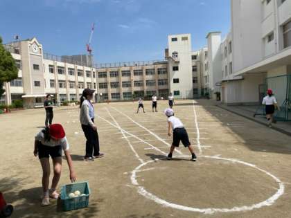 6年生児童が1年生児童のサポートをしたおかげで、とてもスムーズにソフトボール投げの測定ができました!