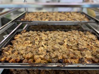 さけのごまみそ焼きは、練りごま、砂糖、うすくちしょうゆ、白みそで下味をつけて、さけを並べた上からいりごまをふって、焼き物機で焼き上げます。