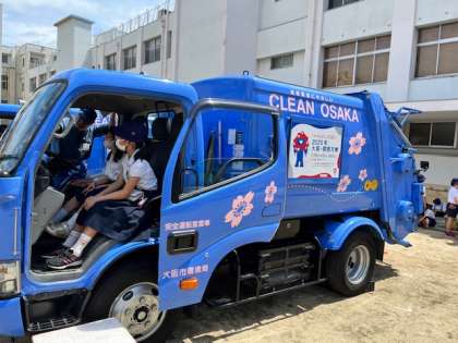 普段の生活でよく目にする、大阪市のパッカー車を間近に、ごみを投入したり、係員の方からお話を聞いたりしました。