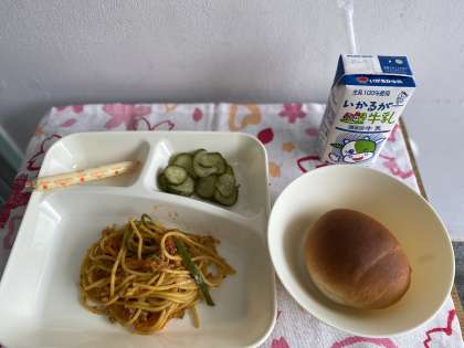「カレースパゲティ」はカレールウの素などで味付けしたスパゲティです。児童にとても好評な献立です。美味しく頂きました。