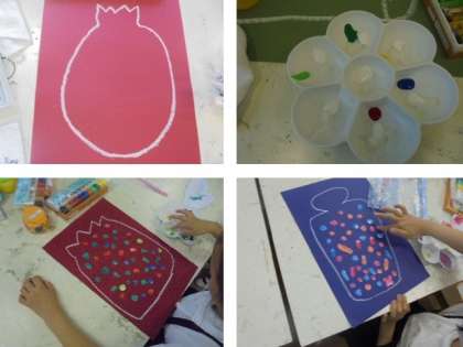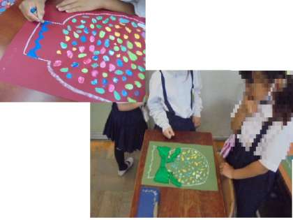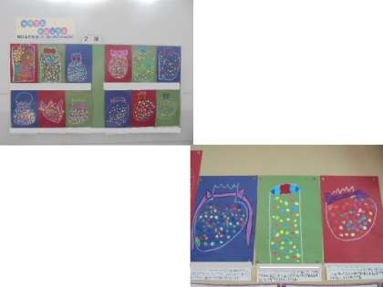 でんぷんのりと絵の具を混ぜ合わせ、ぷっくとしたドロップスを表現することができました。