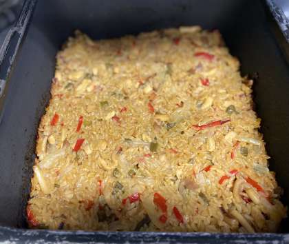 パエリアは鶏肉、いかを主材に、赤ピーマンなどの野菜をオリーブ油でいためたあと、米と調味料を加え、ミニバットで蒸し焼きにします。旬の赤ピーマンを使用し、ピーマンの赤色、さんどまめの緑色、カレー粉の黄色で彩りのよい仕上がりになります。