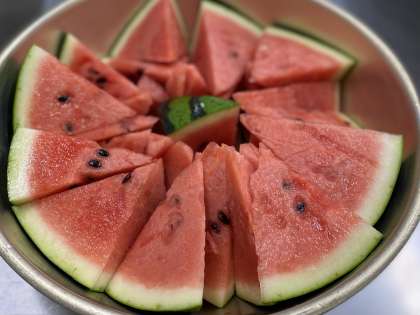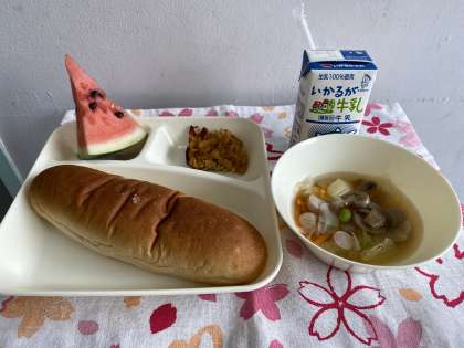一年に一回だけ登場する、夏が旬の「すいか」を組み合わせています。ひと玉を1/64切れずつに切り分けています。甘くて美味しかったです。