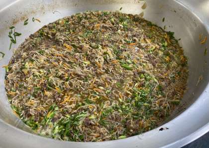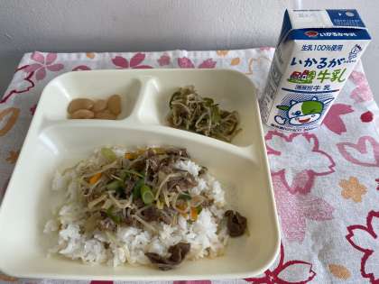 牛丼は子供たちに人気の献立です。牛肉、糸こんにゃく、玉ねぎ、にんじん、えのきたけを甘辛く味付けし、煮ています。斜め切りの青ねぎで彩りをそえています。