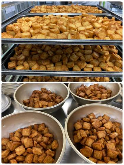 あつあげのしょうがじょうゆかけは、冷凍のあつあげを焼き物機で蒸し焼きにし、しょうが汁、砂糖、こいくちしょうゆでタレを配缶時にかけます。