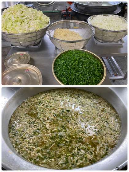 五目汁は、鶏肉を主材に、キャベツ、玉ねぎ、たけのこ、えのきたけ、青みに青ねぎを使用しています。