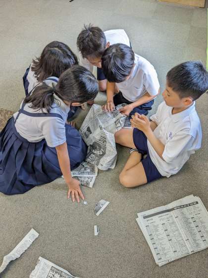 新聞紙を、チームのメンバーで協力をして、ちぎってのばしました。