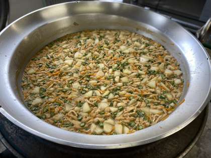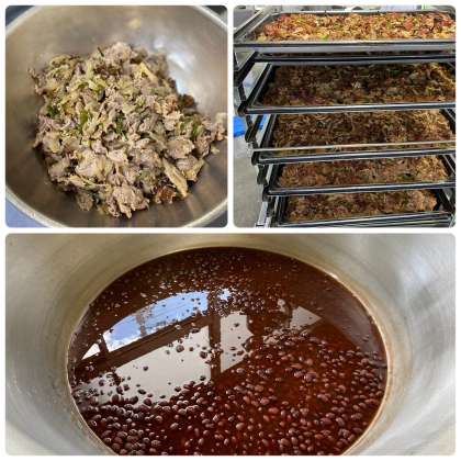 豚肉の甘辛焼きは、豚肉に、砂糖、塩、こいくちしょうゆで下味をつけ、玉ねぎ、ピーマンと混ぜ合わせ、焼き物機でやきます。