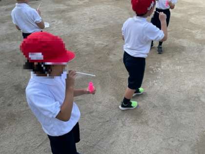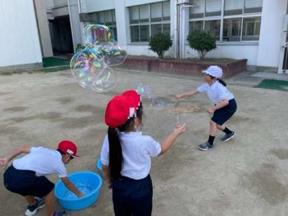 今日の1時間目、1年生が運動場でシャボン玉を飛ばしていました。
