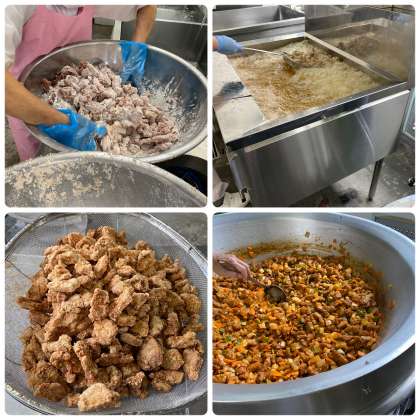 1・豚肉に下味をつけ、でんぷんをまぶして油で揚げる。