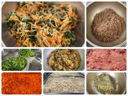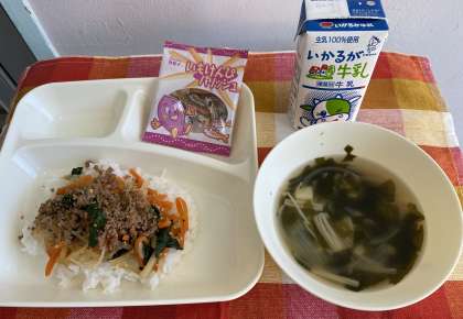 今日の給食は、子供たちに大好評のメニュー「ビビンバ」でした。ビビンバは、韓国・朝鮮の混ぜご飯です。牛・豚ひき肉を主材に旬の大根とほうれん草、もやし、にんじんを使用しています。衛生面に配慮し、肉と野菜の具を別々に配缶しています。