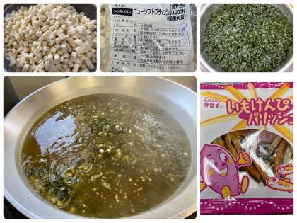 わかめスープは冷凍のとうふ、玉ねぎ、、えのきたけ、たっぷりのわかめを使用した中華スープで、ビビンバによく合うスープでした。