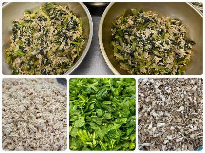 「こまつなのいためもの」はささみ(油漬け)、こまつな、まいたけを使用したいためものです。