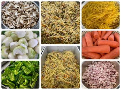「ウインナーときのこの和風スパゲティ」は、ウインナー、ベーコンを主材に、季節の食材のしいたけ、しめじの他、玉ねぎ、にんじん、ピーマンを使用し、醬油ベースの和風の味付けにしています。喫食時にきざみのりをかけて食べます。