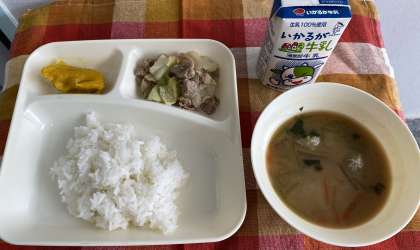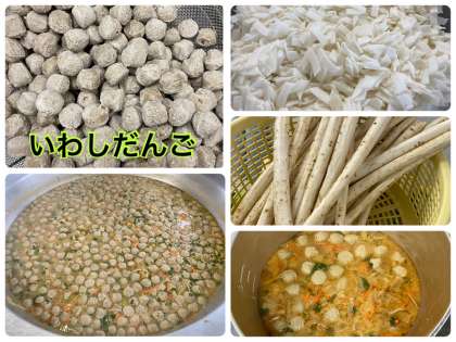 「いわしのつみれ汁」は、ゆでた後、しょうが汁、料理酒で下味をつけたいわしだんごと、だいこん、ごぼう、にんじん、青みにみつばを使用しています。