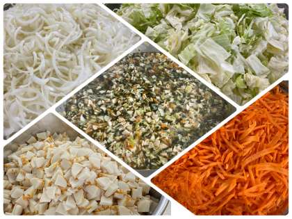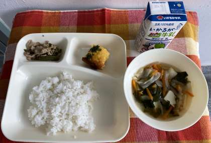 「五目汁」はかまぼこ、キャベツ、たまねぎ、にんじん、わかめを使用し、だしをきかせた彩りよいお汁に仕上がっています。