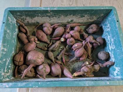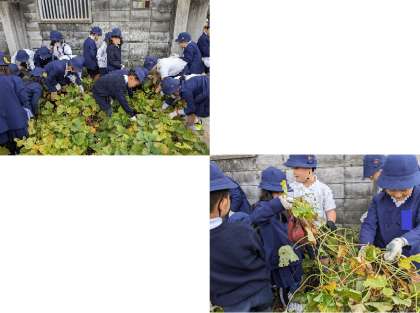 夏から育ててきたさつまいもを収穫しました。掘る前には、