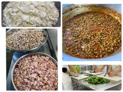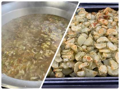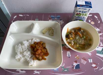 「じゃがいものバジル焼き」は、塩、バジル、オリーブ油で下味をつけたじゃがいものを焼き物機で焼きます。バジルの苦手な子どもたちにも食べやすく工夫された献立でした。