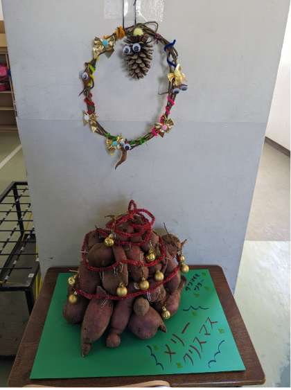 以前収穫したサツマイモの芋はツリーにし、つるはクリスマスリースにしました。