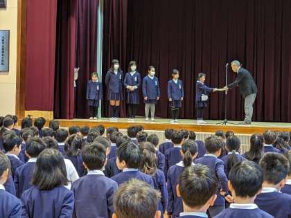 今日の児童朝会では、最初に「読書感想文コンクール」の表彰がありました。