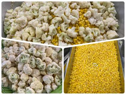 「カリフラワーとコーンのサラダ」は、焼き物機で蒸したコーンと冬が旬のカリフラワーに砂糖、塩、米酢、うすくちしょうゆ、綿実油を合わせたドレッシングをかけてあえます。