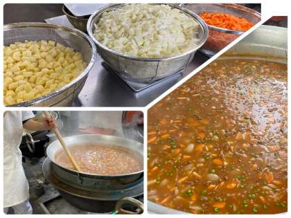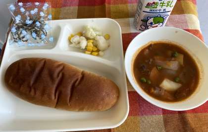 「ビーフシチュー」は児童生徒に好評な献立です。小麦粉と綿実油でルウを作ります。