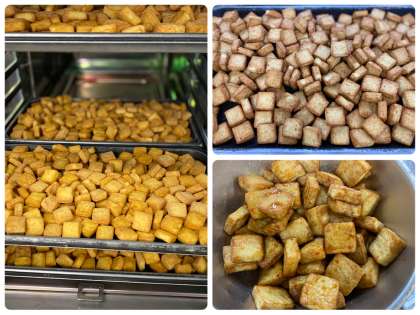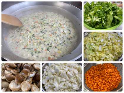 「はくさいのクリーム煮」は鶏肉、はくさい、玉ねぎ、チンゲンサイ、生しいたけを使用し、牛乳を加えて煮、でんぷんでとろみをつけた中華風のクリーム煮です。