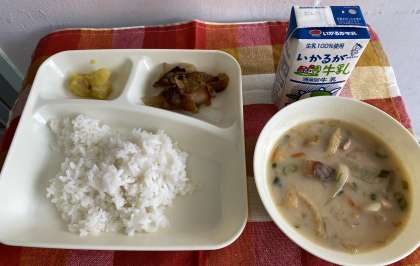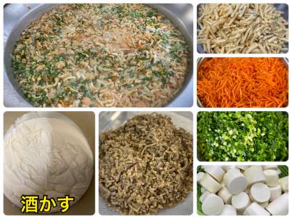 今日の給食のかす汁には、さけ、つきこんにゃく、うすあげ、だいこん、にんじん、青ねぎが入っています。ペースト状の酒かすを使用し、白みそと赤みそを入れることによって、子どもたちが食べやすく仕上げています。
