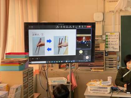 給食に関してのクイズを楽しみ、給食調理員さんへの感謝を述べました。