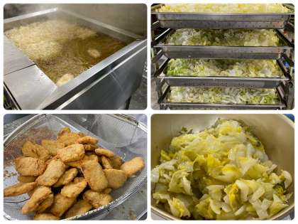 カツ丼は子どもたちに大好評の献立です。一口カツは冷凍のままなたね油であげます。