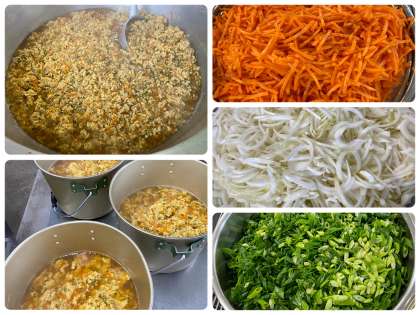 具はたまねぎ、にんじん、青ねぎを煮て味付けし、液卵を流し入れます。配食時に具をご飯の上にかけ、一口トンカツをのせて食べます。