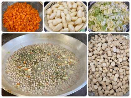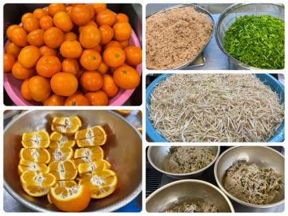 給食では、牛肉やウインナー、じゃがいも、キャベツ、にんじん、パセリを使っています。