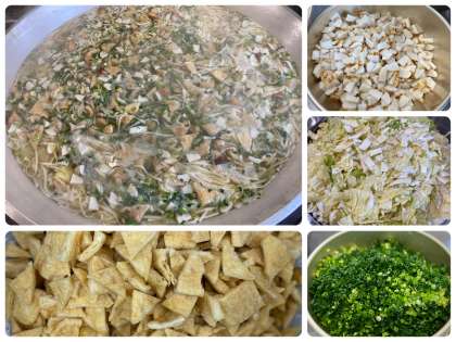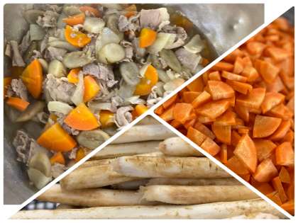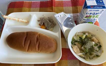 なにわうどんは大阪で生まれたといわれているきつねうどんをイメージして作られています。給食では、1/16の三角に切ったうすあげを焼き物機で煮ます。かまぼこ、はくさいと青みに青ねぎを加え、だしの旨味を味わうことができるシンプルなうどんに仕上げています。教室で配缶後、とろろこんぶを入れて食べます。